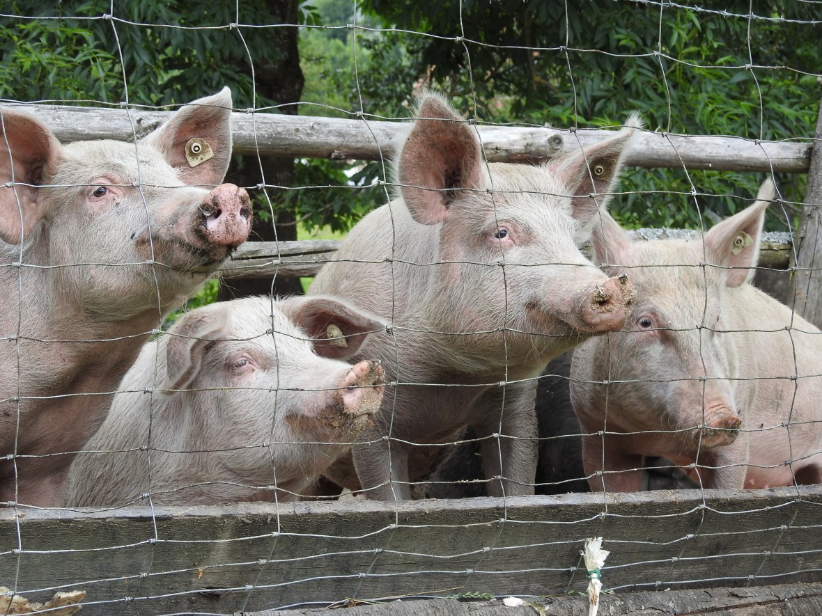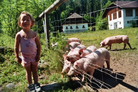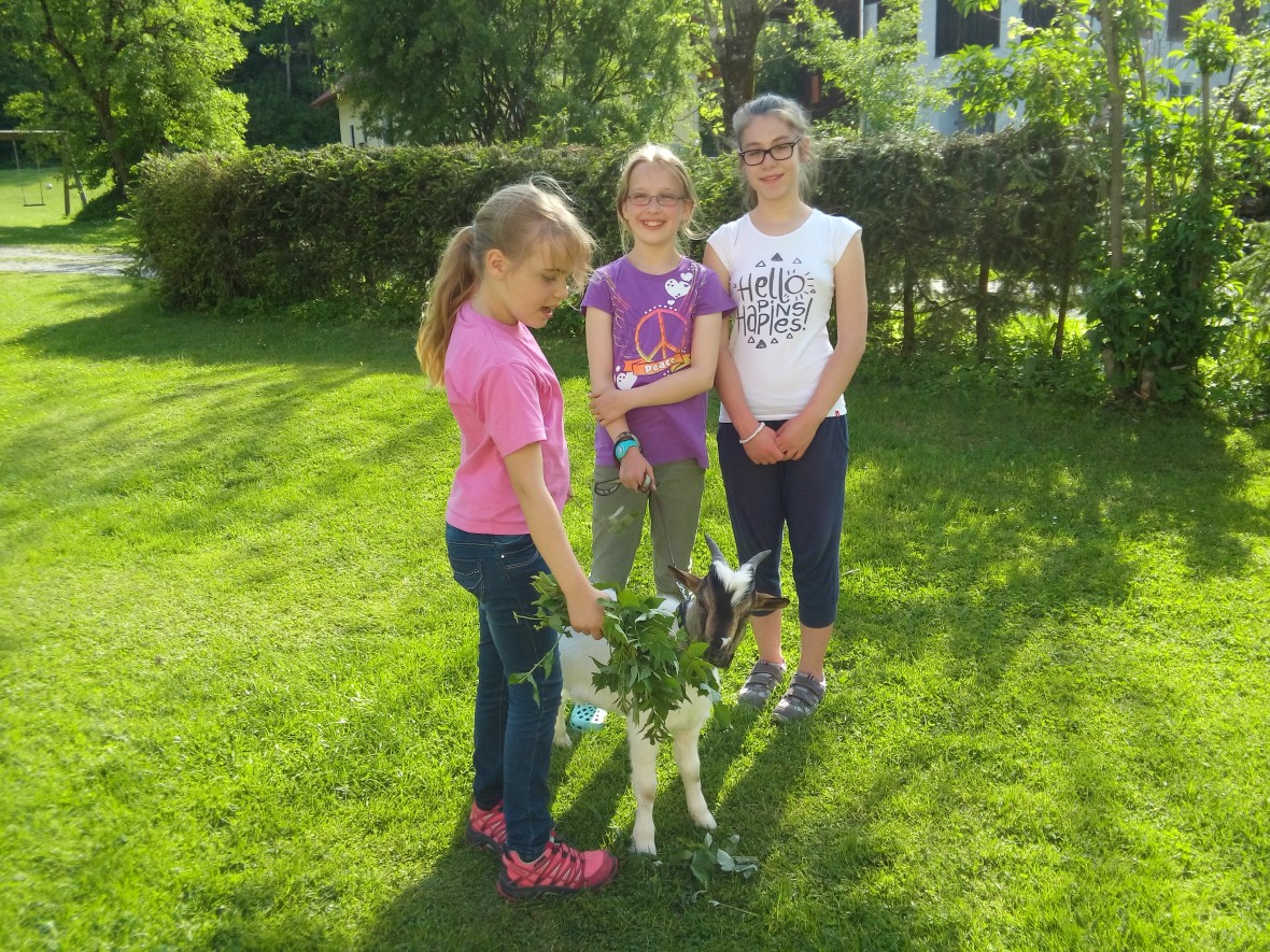 Unseren Schweinen geht´s besonders gut, sie sind auf der Weide hinter dem großen Kastanienbaum und freuen sich über Futter. Unsere Ziegen freuen sich auf ein Stück getrocknetes Brot.